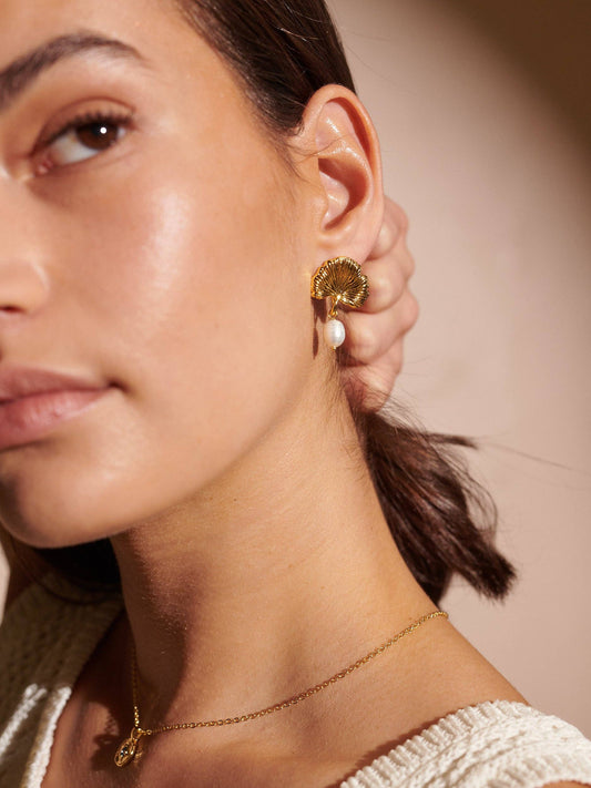 Leaf Pearl Earrings - 18K Gold Pleated