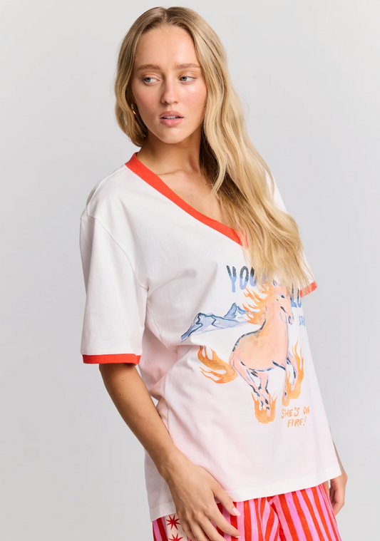 She's on Fire V-Neck T-Shirt - White and Orange