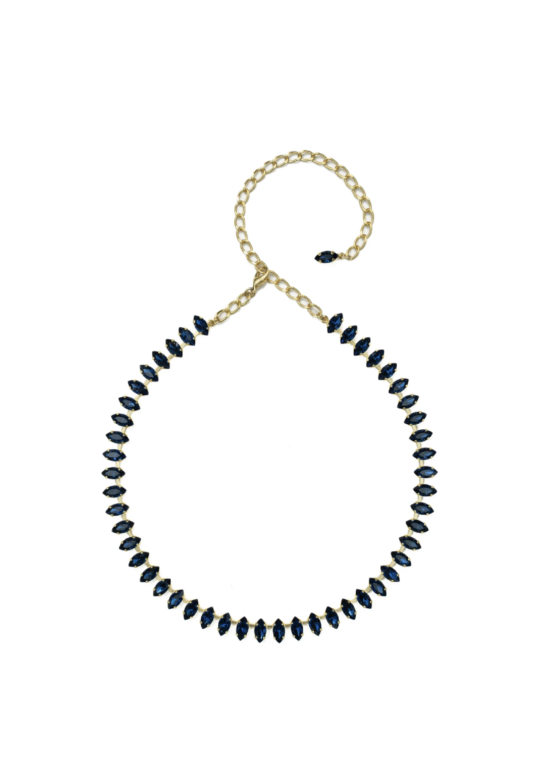 The Astrid Necklace in Navy showcases exquisite sapphire marquise glass crystals meticulously arranged to catch and reflect light.